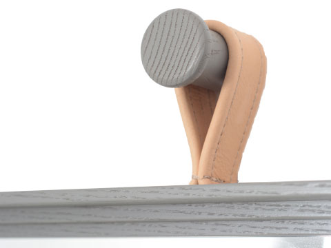 Spegeln Folke finns i tre storlekar och hängs upp med hjälp av en lädersleif i valfri färg och en träknopp som matchas valt träslag/kulör.